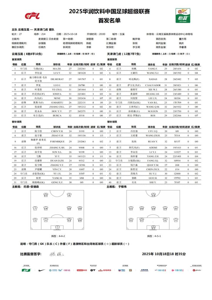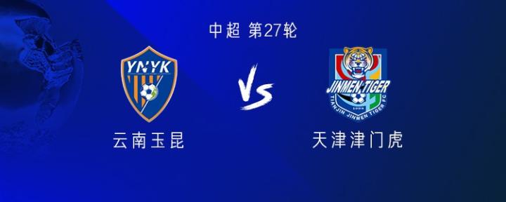 北京时间10月18日20:00,中国足球超级联赛第27轮赛事中,云南玉昆队将在主场迎战天津津门虎队,本场对决的主裁判由麦麦提江担任,视频助理裁判(VAR)由徐强强担任,赛前双方球队已公布各自的首发阵容名单: